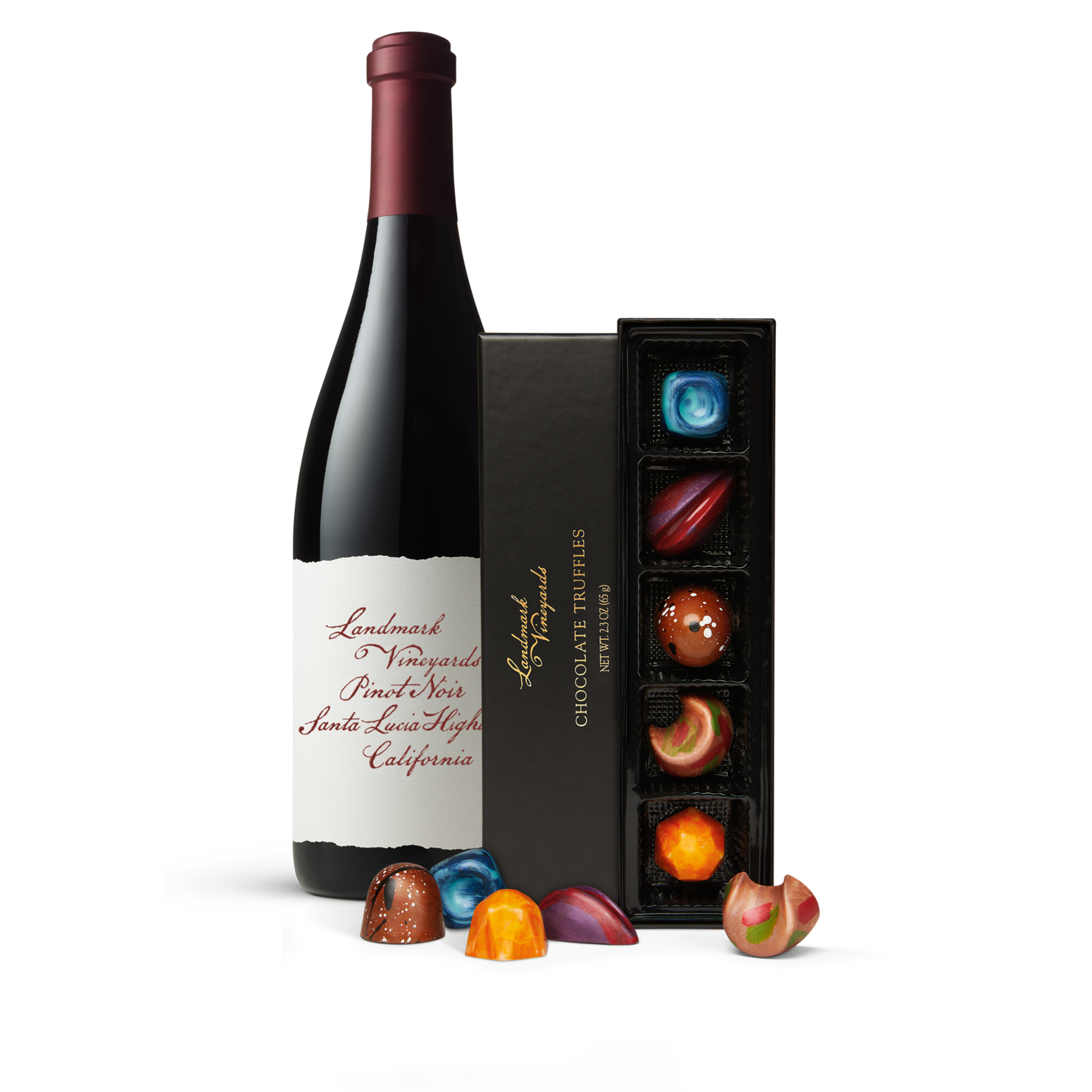 Made in-house, our gourmet Landmark Chocolate Truffles include five delicious assorted truffles that are handcrafted with high-quality white, milk, and dark chocolate ganache. Paired with our 2022 Santa Lucia Highlands Pinot Noir 750mL, it’s a pairing that’ll melt the heart of any chocolate lover.